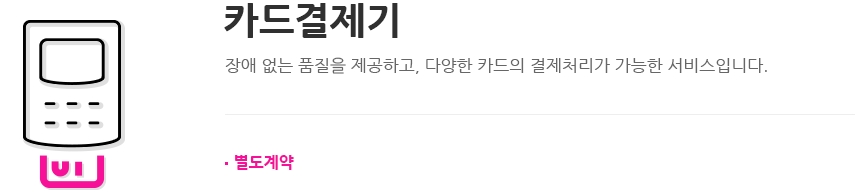 - 카드결제기 서비스는 제휴 대리점과 별도 계약 진행되며, 계약 관련 사항은 제휴 대리점의 정책을 따릅니다.