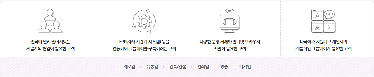 | 제공기능 | 메일, 쪽지, 전자결제, 게시판, 업무관리, 일정관리, 웹디스크, 근태관리, 주소록, 조직, 프로젝트, 동호회 운영 기능, 공용설비예약, 설문조사, SMS | |
