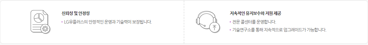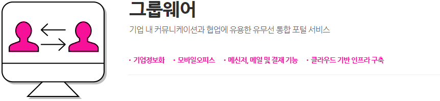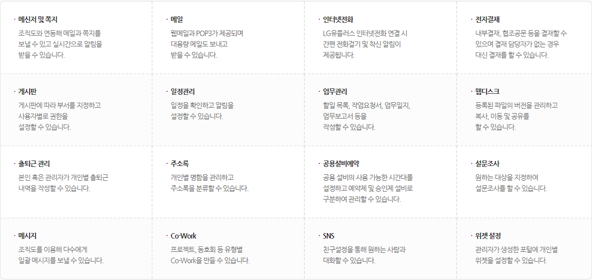 | 제공용량 | 이용자당 메일 2GB, 오피스 500MB(U+ Box에서 무료로 제공되는 용량 10GB를 그룹웨어와 연동하여 사용할 수 있습니다.) | |